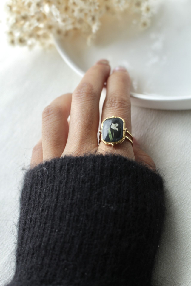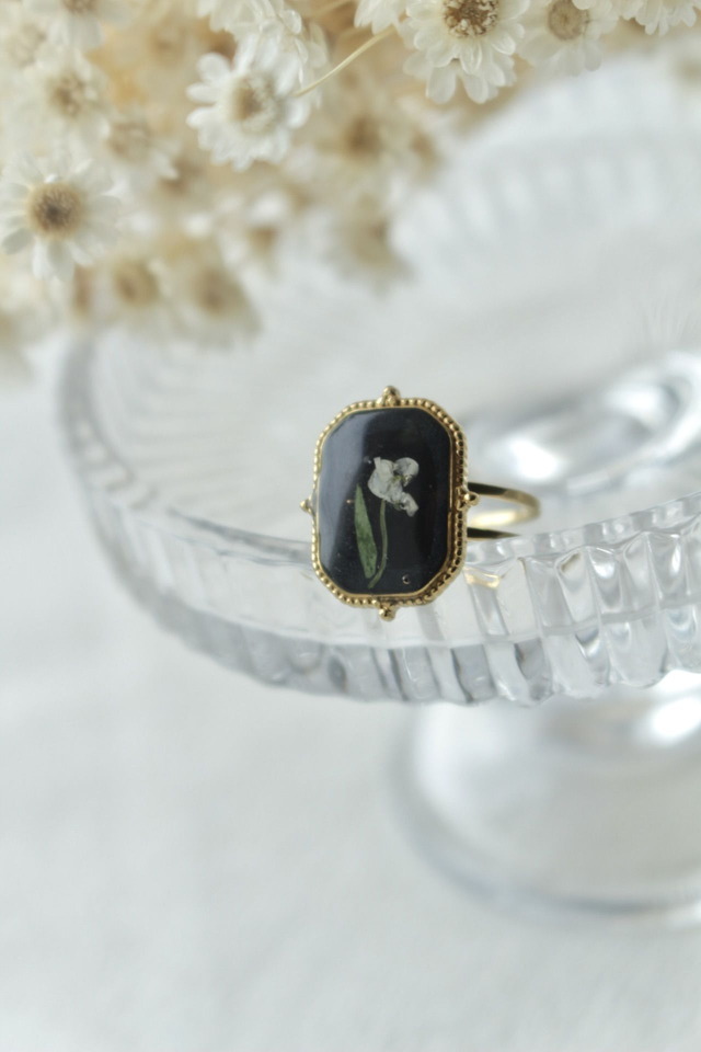 Bague en acier inoxydable plaquée or, vintage ornée de véritables fleurs de carotte sauvage. Il mesure environ 12mm. Elle est est composée de résine,d'une petite fleur séchée